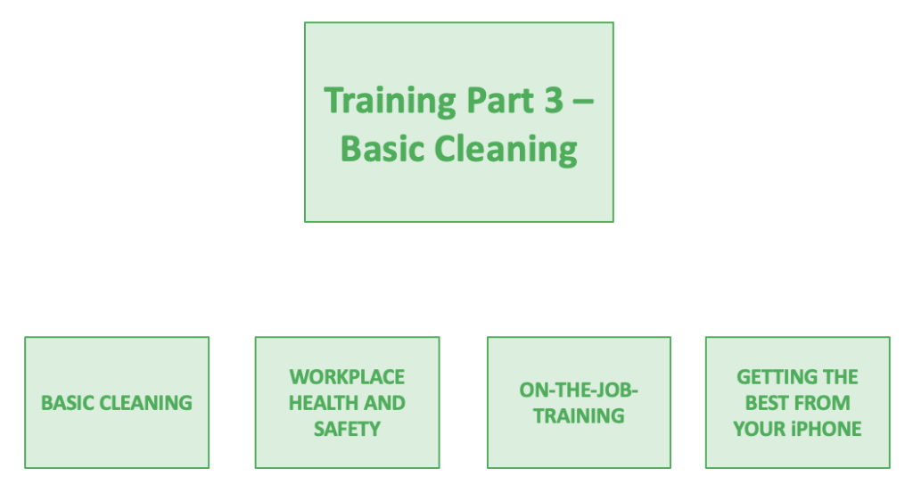 Fenix training comprises four main sections, as shown in the figure below. This part, Part 3 – Basic Cleaning is a key part of the training and is intended to define the way in which an IC consistently delivers a high-quality outcome with a minimum requirement for involvement or intervention from the Fenix management team. This outcome should be consistently of such a quality that the IC feels contented, Fenix management is barely aware of the job and all requisite information has been supplied, the client, customer, tenant, agent and /or owner is very pleased and happy to provide a positive review.